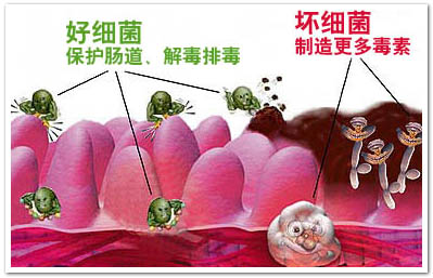 有益菌能够调整肠道环境,抑制有害菌在肠内的繁衍,使肠内功能正常化,促进肠道内积存的毒素排出体外。此外,当好菌占多数时,害菌就没有“作怪”的空间,害菌自然会较少。益菌可以形成一个“防火墙”或“盾牌”,让害菌没有机会接触到肠壁。 相反地,当体内的害菌比益菌多时,就会产生毒素,加重肝脏的负荷,引发肝脏疾病;或是使肠道纤维化,引起结肠癌(colon cancer)。 除了保持良好的饮食习惯,人们也可以通过多吃乳酪(yoghurt)、乳酸食品及饮料、高纤维食品,改善肠道健康。